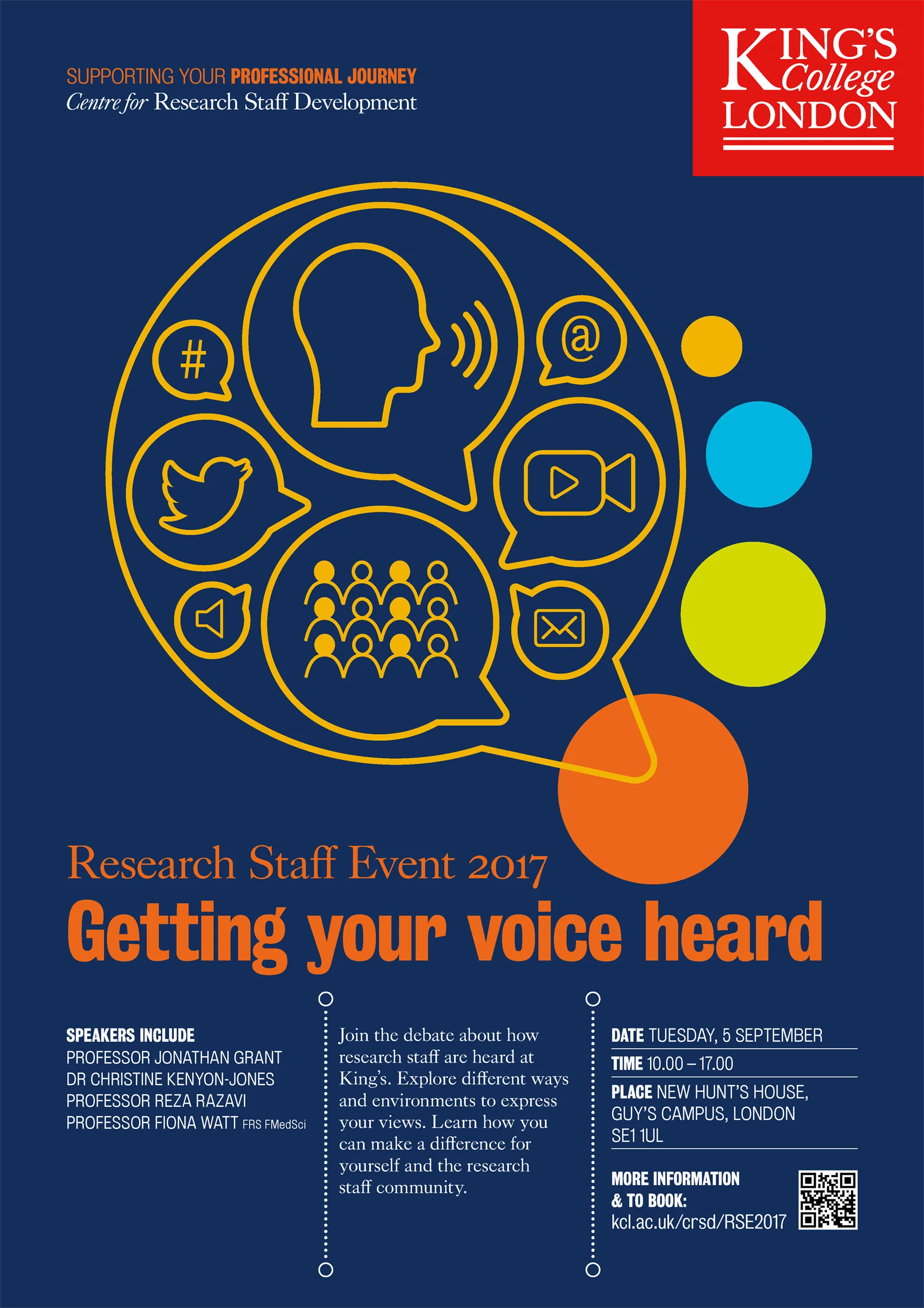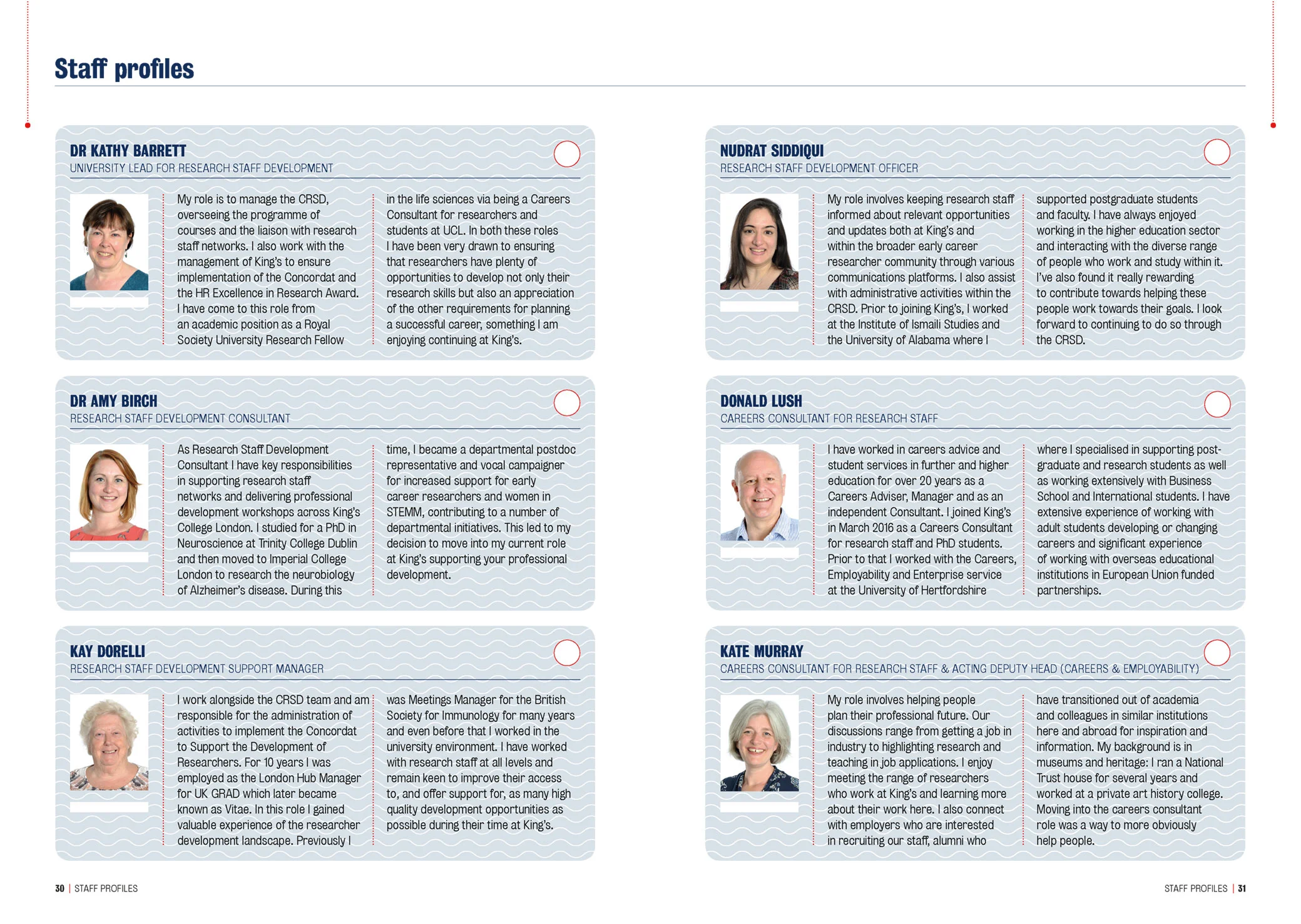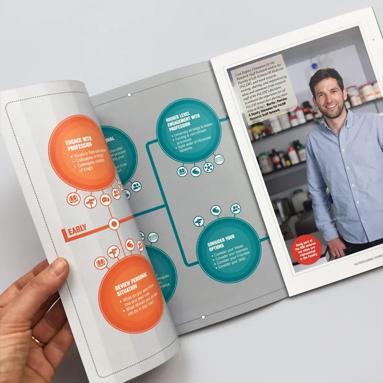 The Centre for Research Staff Development (CRSD) at King’s provides professional development support for research staff to achieve their potential, before, during and after their time at King’s, with active support from the most senior staff in the university. The brief for this annual project was to design a sub-brand for the Centre in compliance with King’s brand guidelines along with a set of printed and digital assets including a flagship B5 format brochure illustrating ‘The Research Journey’, a key message of CRSD. Images of research staff from specially-commissioned photo shoots were used on the printed materials and also online. In addition, posters, postcards, web-banners and social media assets were also designed to communicate CRSD’s launch, work and annual events with a colourful style and visual consistency.