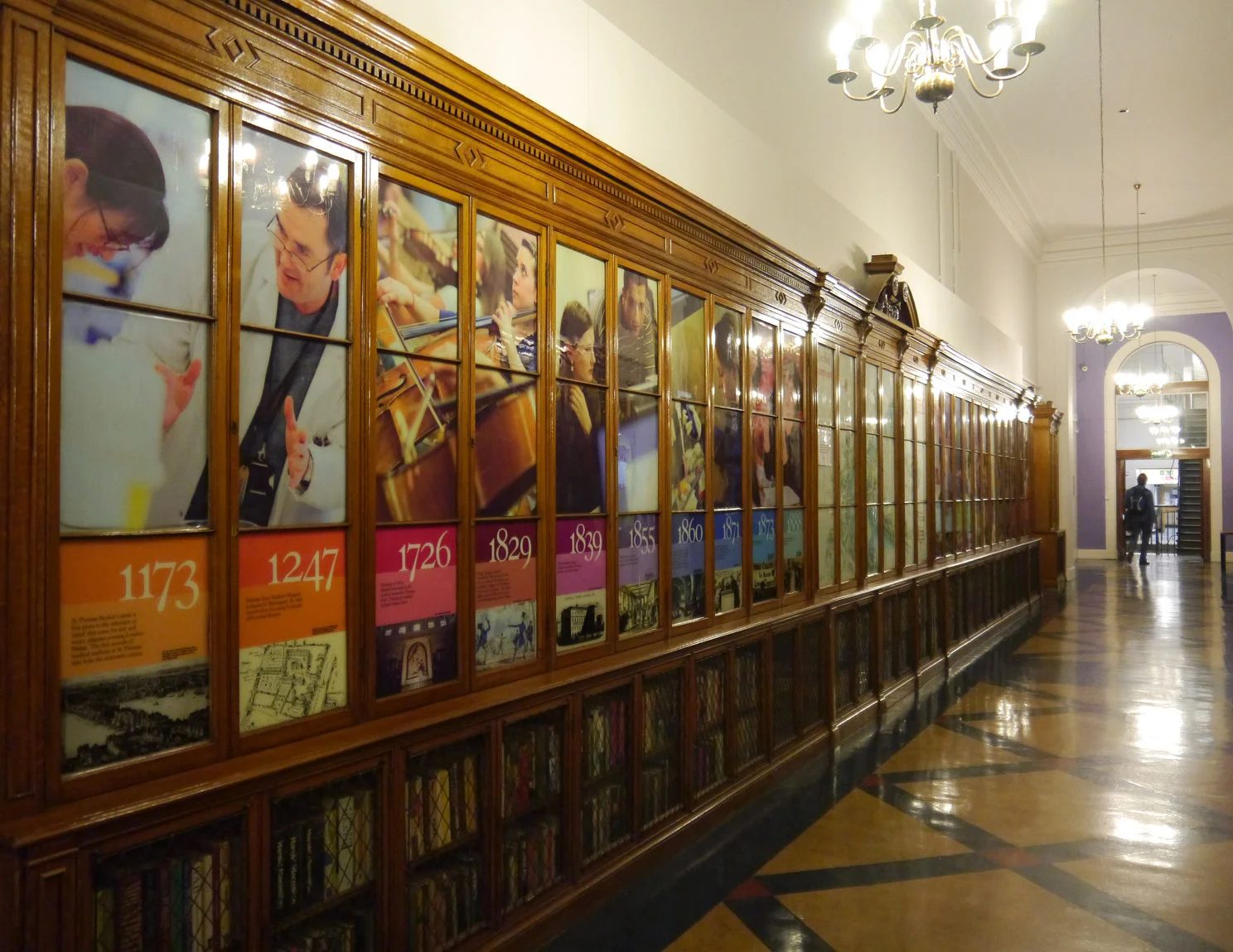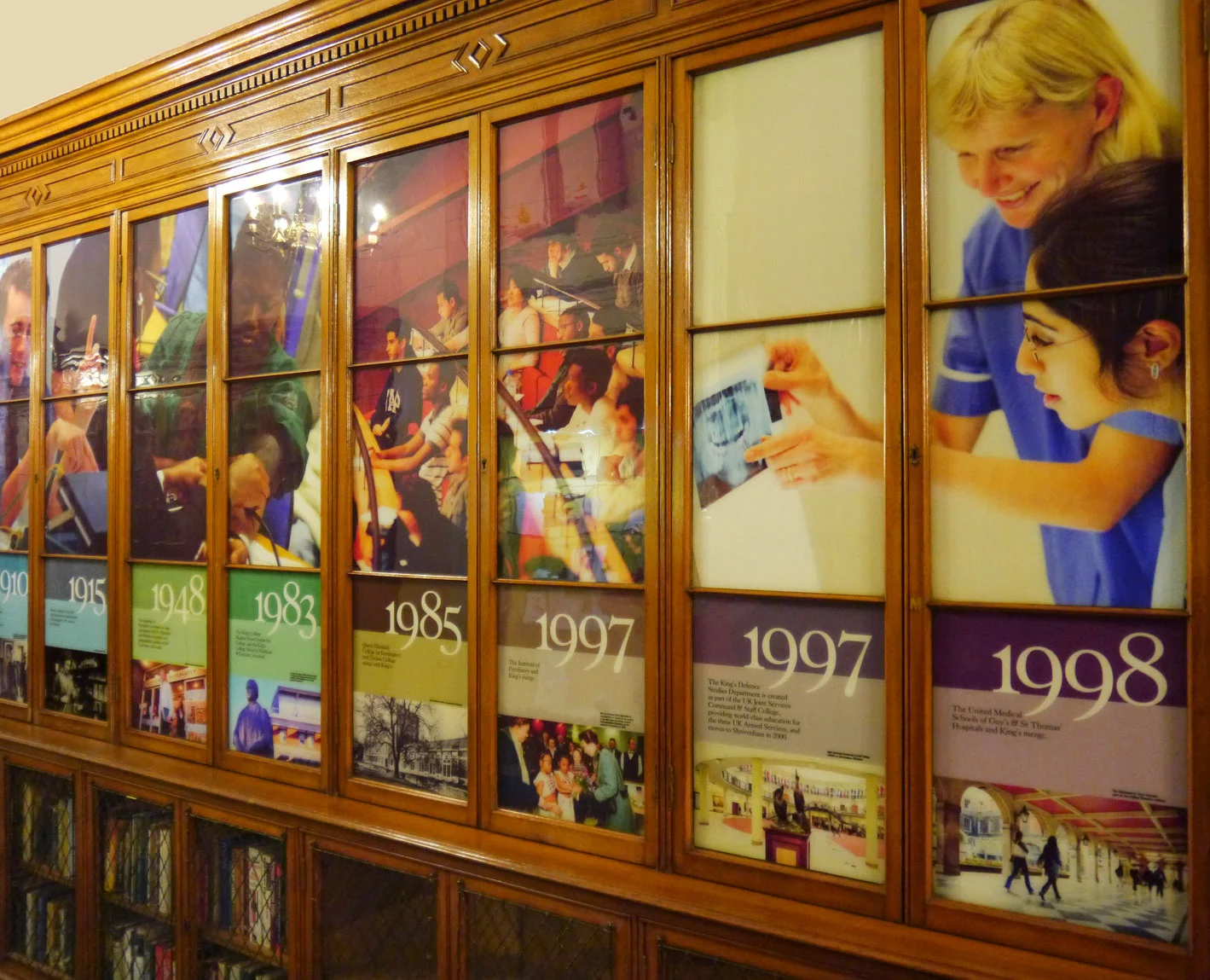 The aim of this project was to provide an area of vibrant information graphics in a busy section of the Campus that received little natural light and to make good use of antique display cases. The installation reflects the evolution of the university through the use of a colour-coded timeline covering specific milestones in its history. It is combined with images from King's extensive photographic archive.